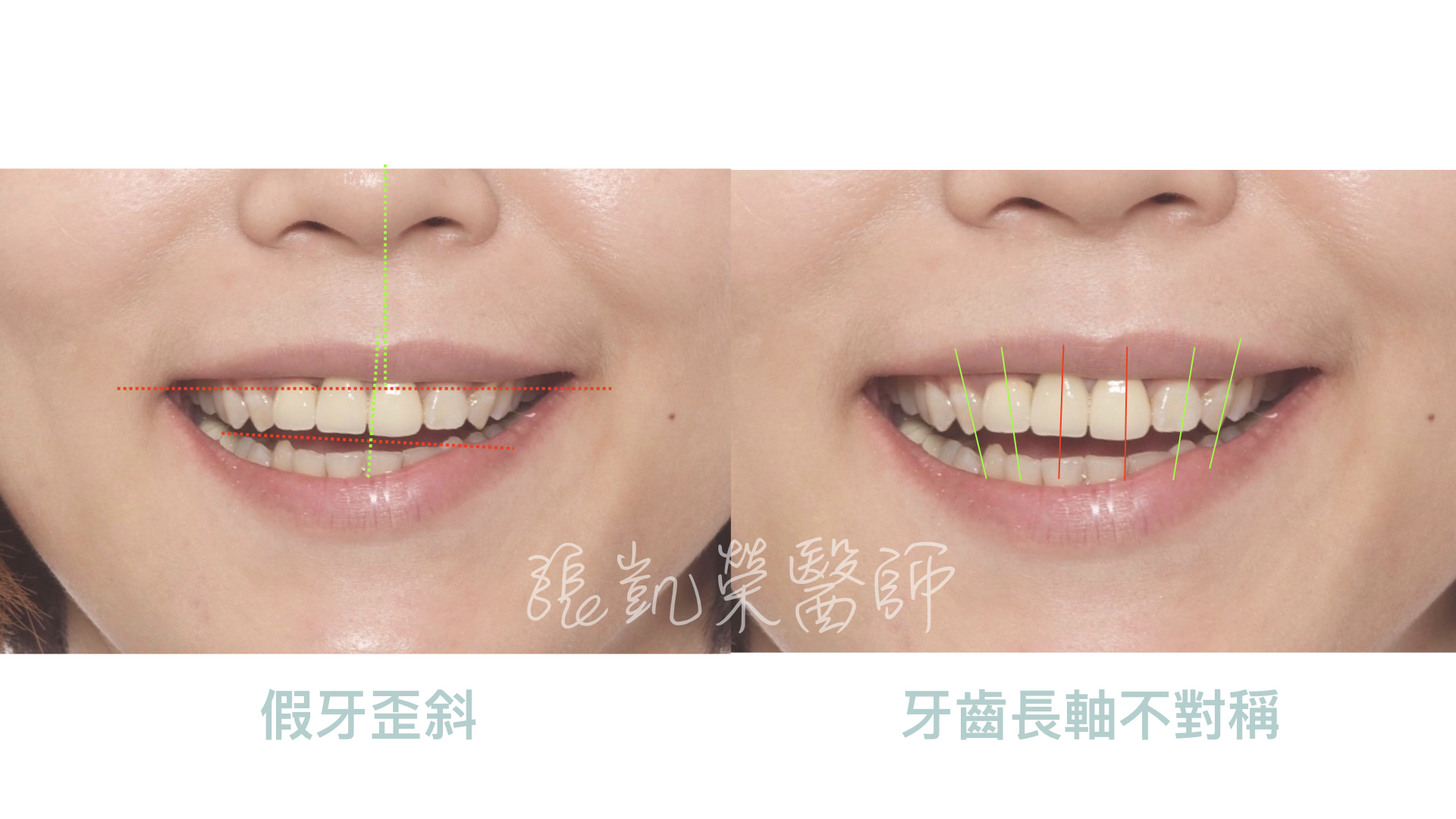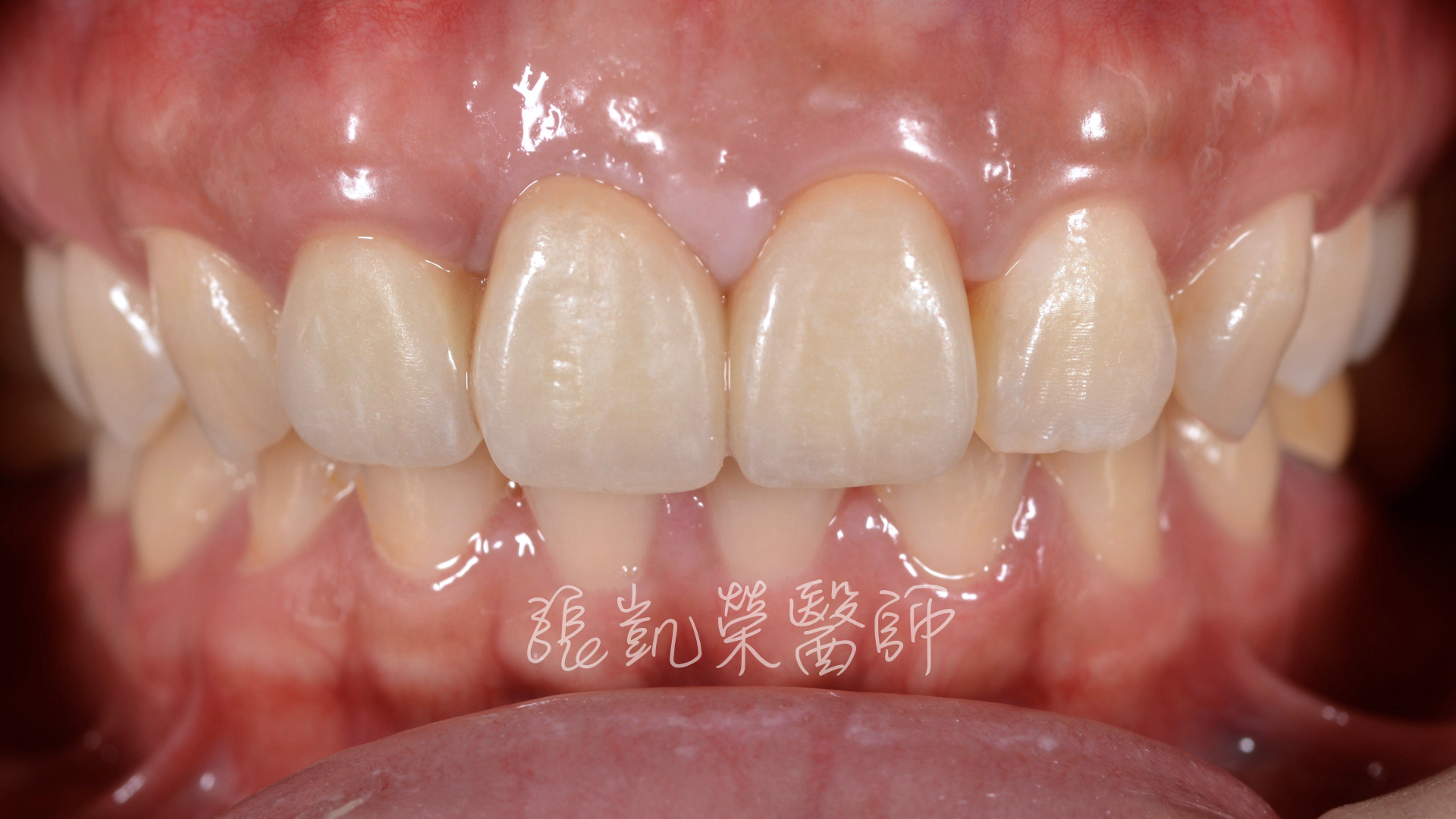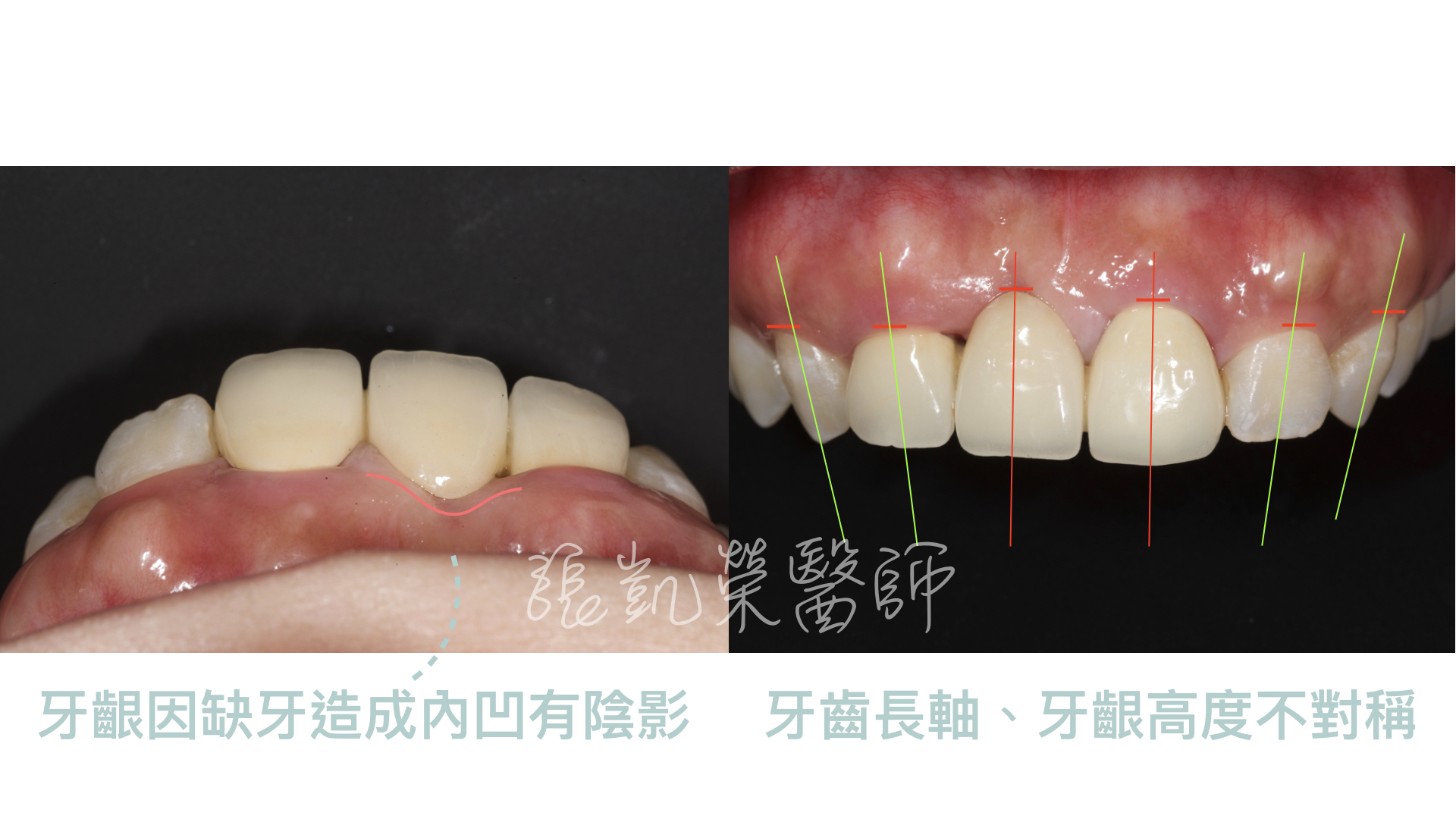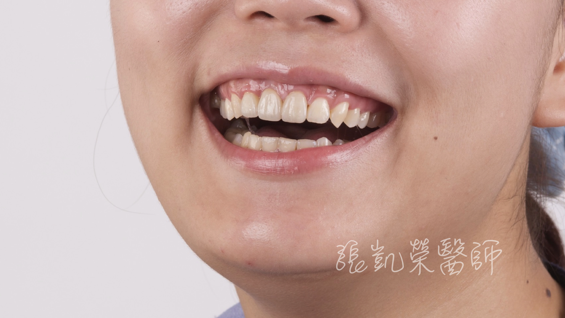 C小姐來到門診,主要針對做了十幾年的假牙,覺得不美觀,除了假牙顏色外,牙齒歪斜,還有牙齦處黑黑的,照相時覺得牙齦有暗影。 經診察後,發現假牙型態不佳,牙橋體(缺牙處)下面,因為缺損多年,所以牙肉萎縮,光線照起來有暗影;榮醫師建議除了假牙更全瓷冠換外,再由牙齦整形術重建牙齦缺損與調整牙齒長度調整囉。 不整齊的舊假牙