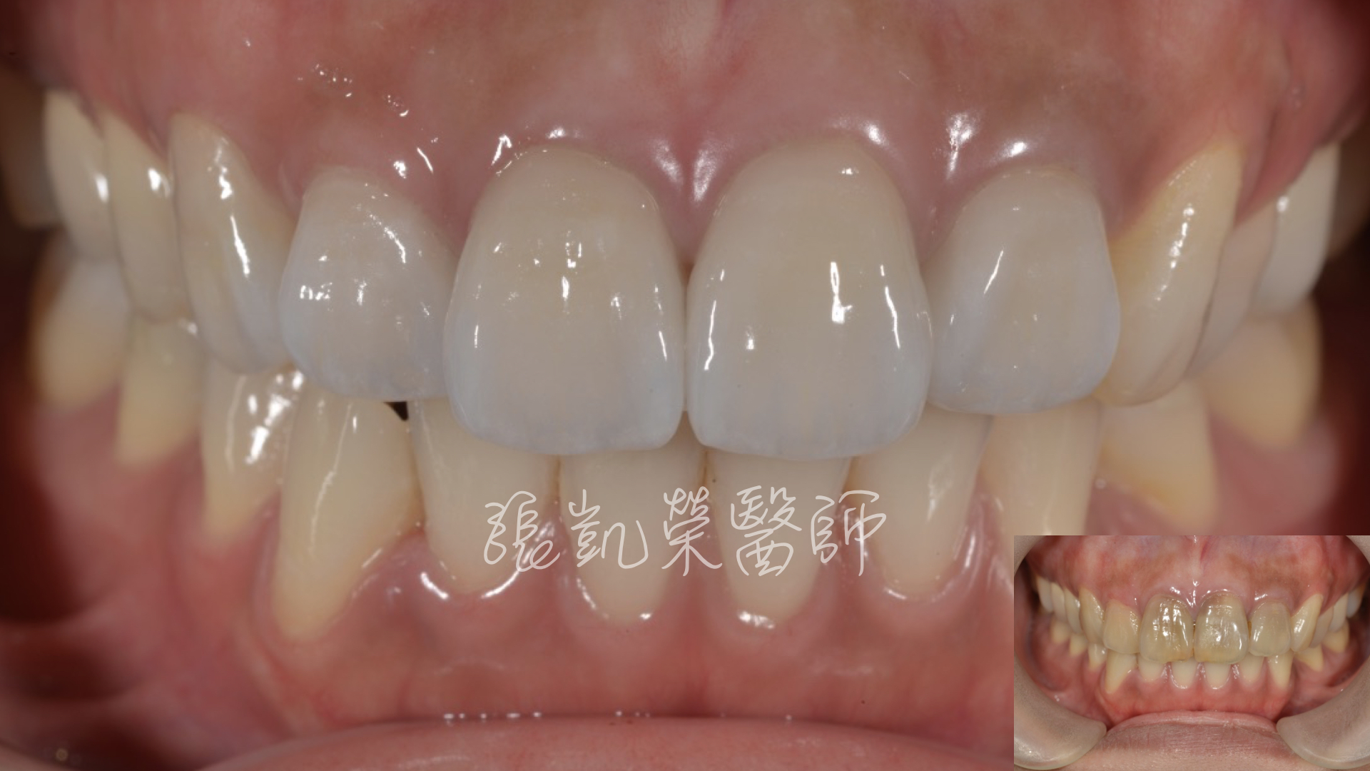 W小姐覺得從小就牙齒黃黃的,本來是預計要做美白。 榮醫師檢查後,發現他牙齒黃黃的是因為小時候牙齒根管治療,牙齒顏色變深,而且根管治療過程牙齒齒質也受到傷害,所以榮醫師就建議針對牙齒變黃的部分進行全瓷冠治療,一來可以保護牙齒,二來也可以改善牙齒顏色美觀,讓W小姐可以不用再為這個多年的黃板牙煩惱了~~