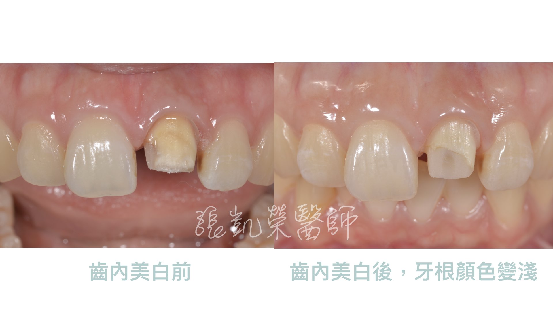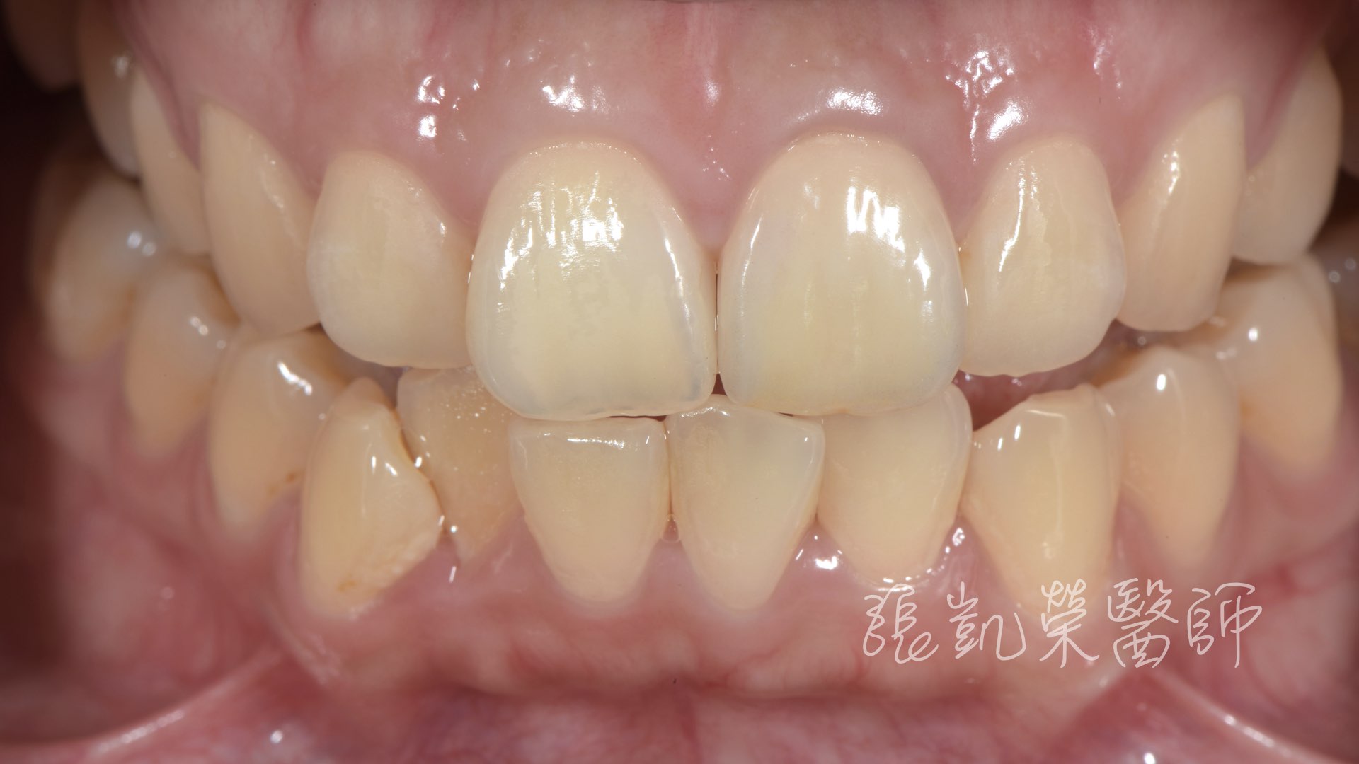 C小姐初到門診,年輕、氣質、美麗外,多了一份羞澀,榮醫師檢查後,發現C小姐門牙因為根管治療後,牙齒變暗變色,加上位置在門牙,所以他就不敢開懷大笑。 根管治療後,整個牙根都會變深,為了減少牙齦與全瓷冠透出暗影,所以全瓷冠之前,榮醫師先將牙齒內部做『齒內美白』,等牙根整個漂白後,再將全瓷冠放上去,讓C小姐可以開懷放心的笑囉~~
