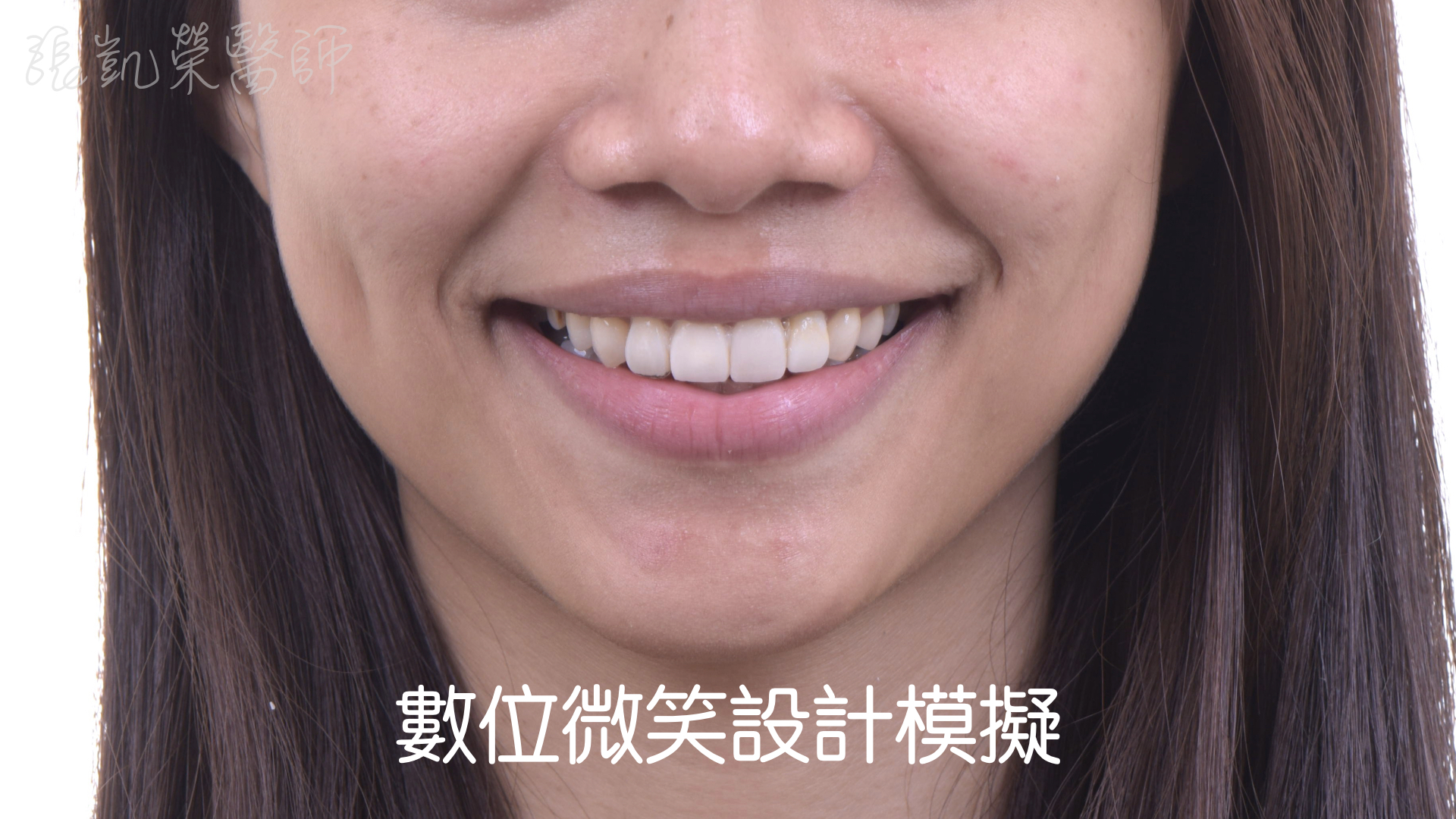 廖小姐對於門牙的舊假牙邊緣變黑很不滿意,而且牙齒偏黃,每次照相都只是微笑,總是對自己的笑容沒自信。 榮醫師診察後,除了牙齒顏色偏暗、舊假牙不美觀外,門牙排列與長度也可以適當做些調整,可以讓微笑曲線更協調。 榮醫師先做了數位模擬,讓廖小姐有具體實物可以參考,了解榮醫師建議的微笑曲線是否本人也滿意;溝通完畢後,做了全口美白、全瓷冠、全瓷貼片,除了改善原本在意的問題,也讓笑容和諧度整體提升,能有自信的笑容。
