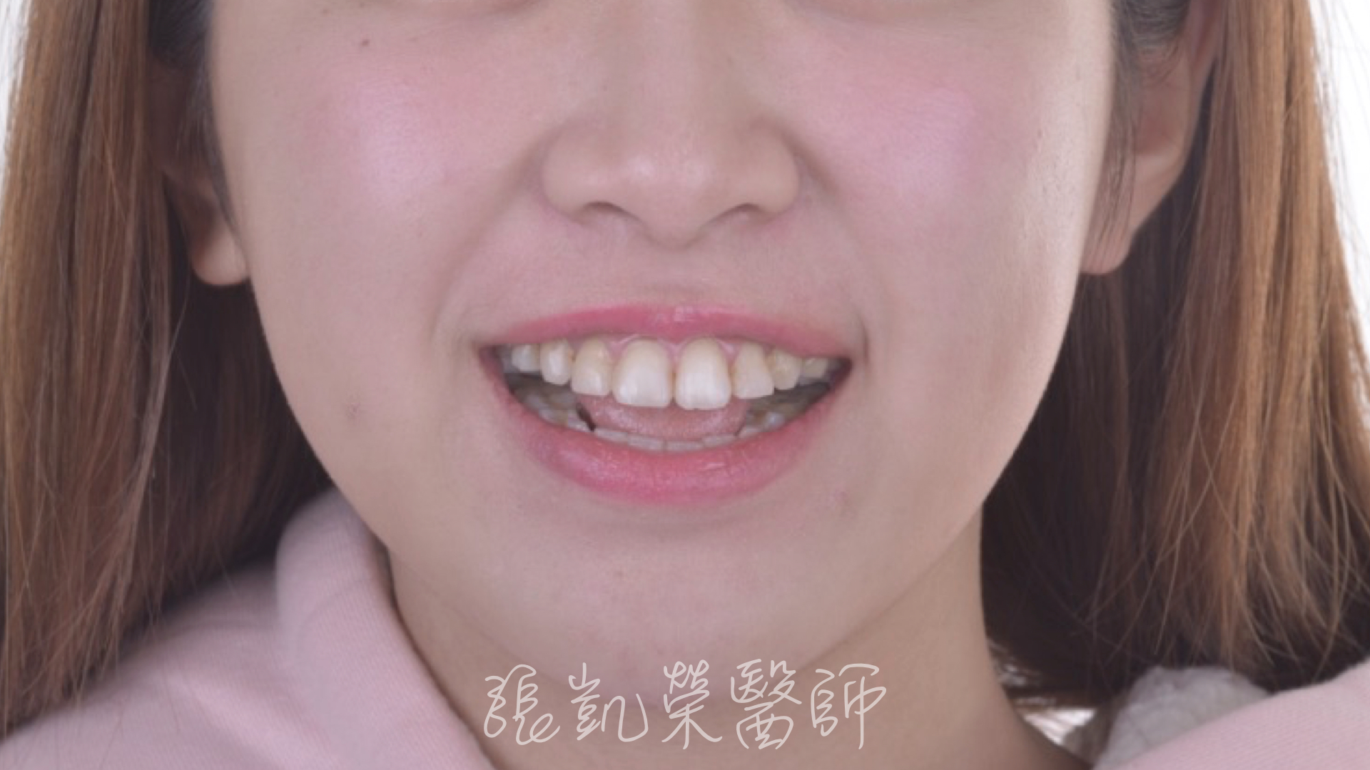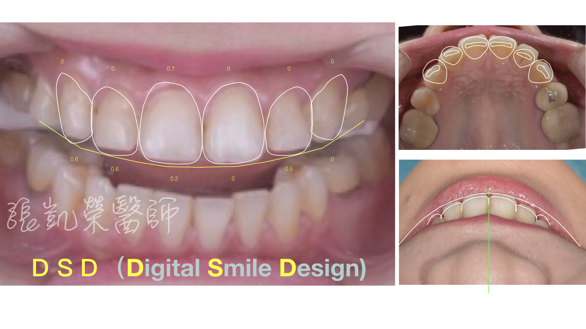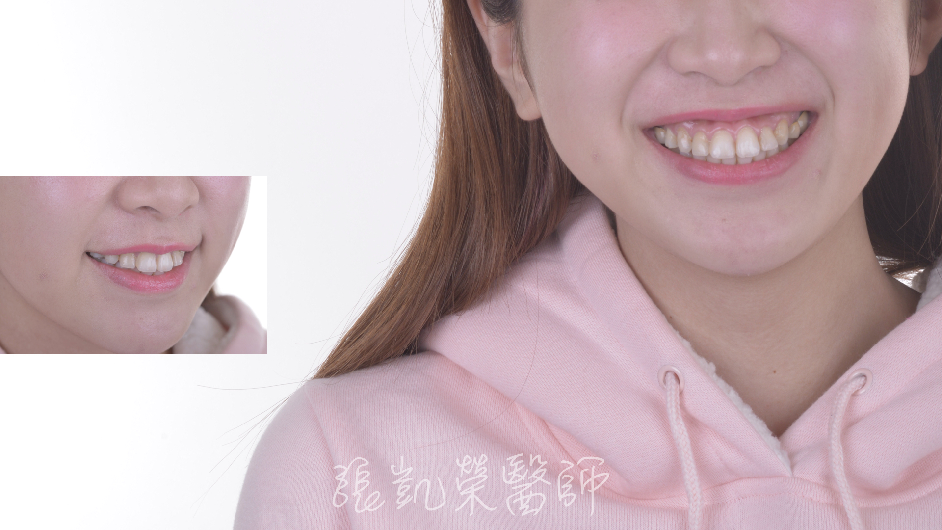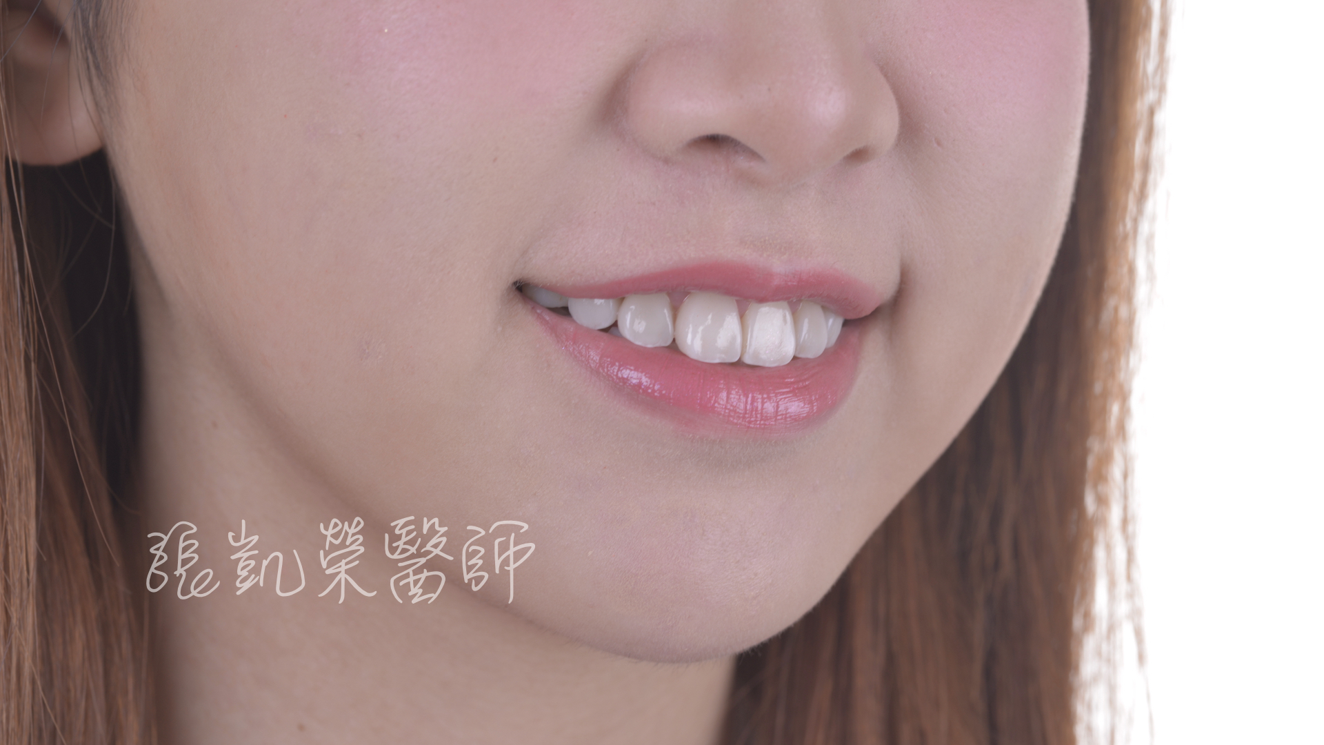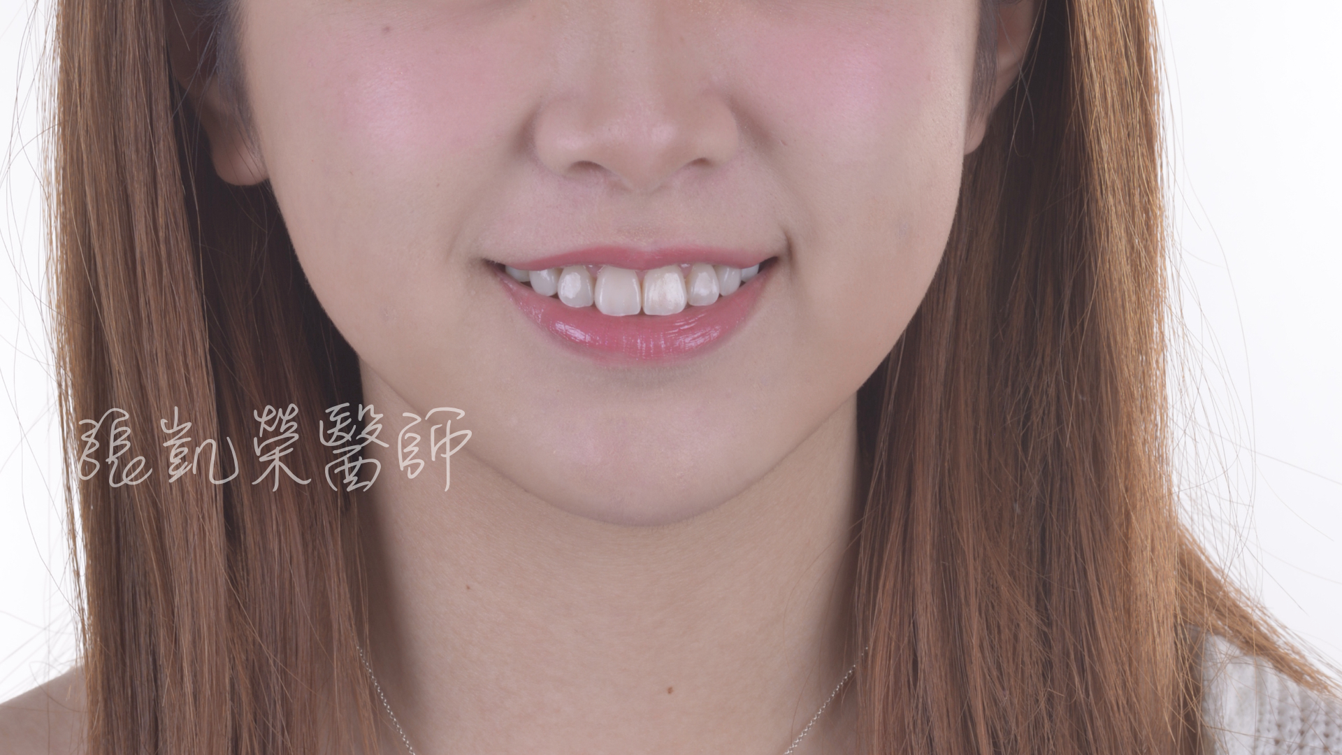 L小姐因為有其他因素,無法接受再次矯正,榮醫師就針對他的狀況,先做數位模擬(DSD, digital smile design)與L小姐溝通,並不是將牙齒內縮,而是將牙齒排列做些巧思,讓“視覺”比較不會有凸出來的感覺;模擬後,L小姐也滿意這樣的方向,於是就用貼片的方式,重新塑造微笑曲線,讓L小姐不再害羞於自己的笑容。
