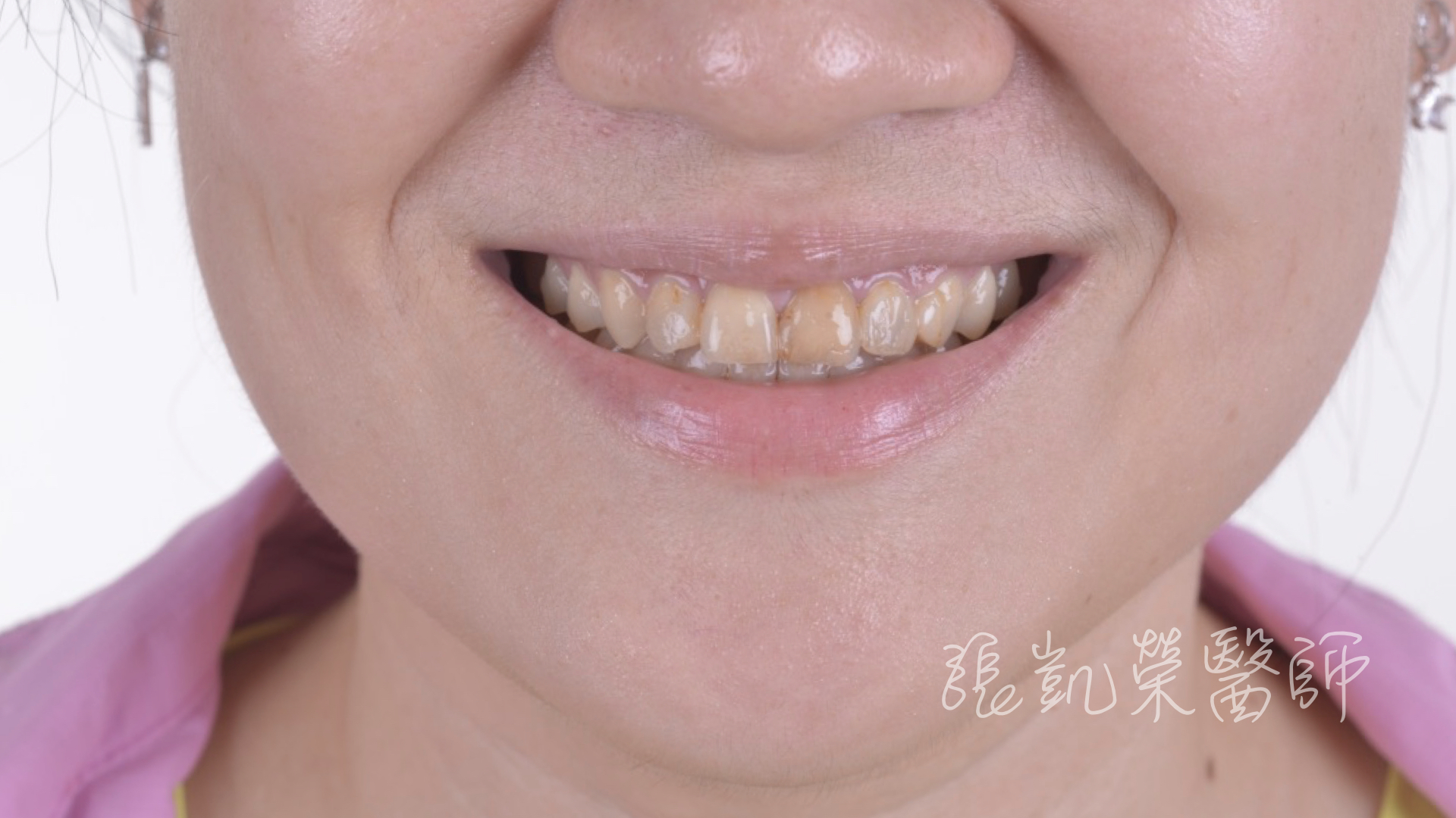 榮醫師檢查後,發現除了牙齒原本有許多舊樹脂填補外,側門牙是屬於比較小顆的錐狀牙,之前為了矯正,先用樹脂補出適當的大小,但經歷過三年,樹脂變色了,並且與牙齒的交界處產生色素沈積。榮醫師建議除了中門牙因為根管治療用全瓷冠保護外,其餘牙齒用貼片改變牙齒美觀與型態。