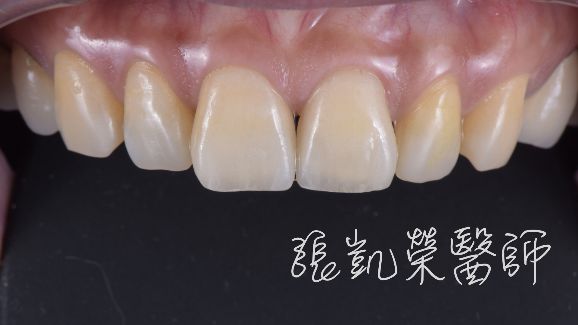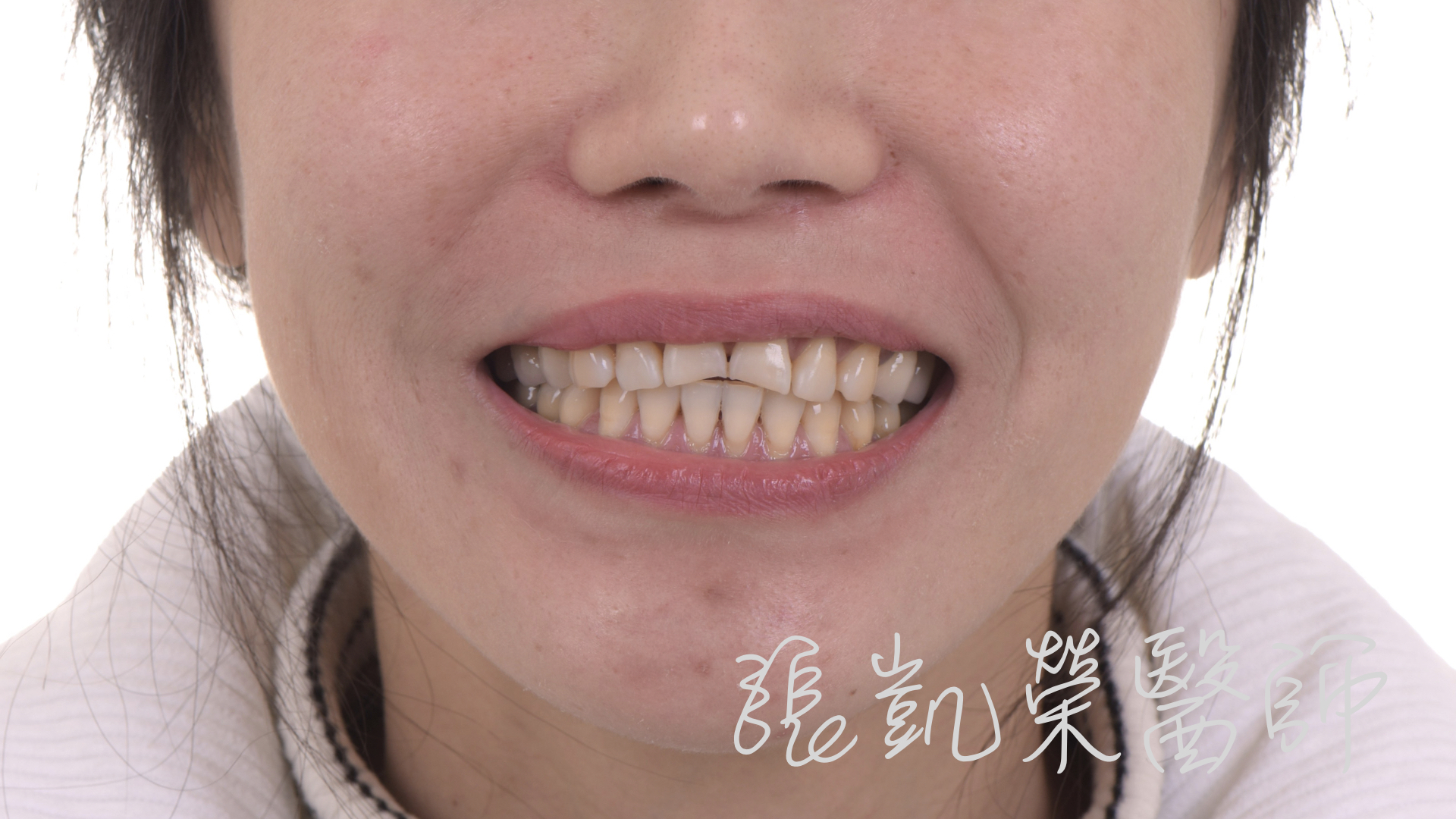 邱小姐因為牙齒排列不整,加上以前喜歡用門牙啃梅子的習慣,造成門牙磨損成“八”字型。 矯正後來到榮醫師門診,希望針對門牙磨損的部分做改善,但至於顏色想維持現在自然的狀態。 經評估分析後,除了牙齒磨損,還有牙齦高低不整的問題,這會影響貼片的型態;經討論、模擬、溝通後,先牙齦整形術,等待牙齦修復後,在處理門牙貼片,讓邱小姐重回自信的笑容。 牙齦高低不齊,影響牙齒型態