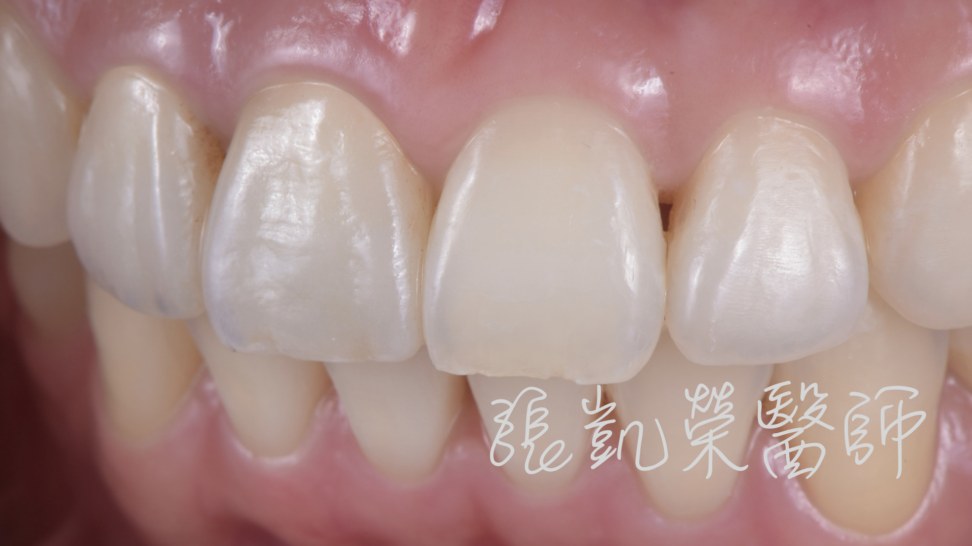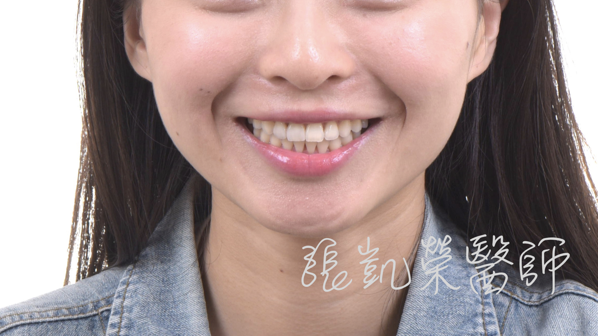 L小姐矯正後,雖然把牙齒排列整齊,但是門牙的臨時假牙,讓他不敢露齒微笑;榮醫師診治後,發現L小姐只需重新更換全瓷冠,再加上全口美白,就可以有燦爛自信的笑容。
