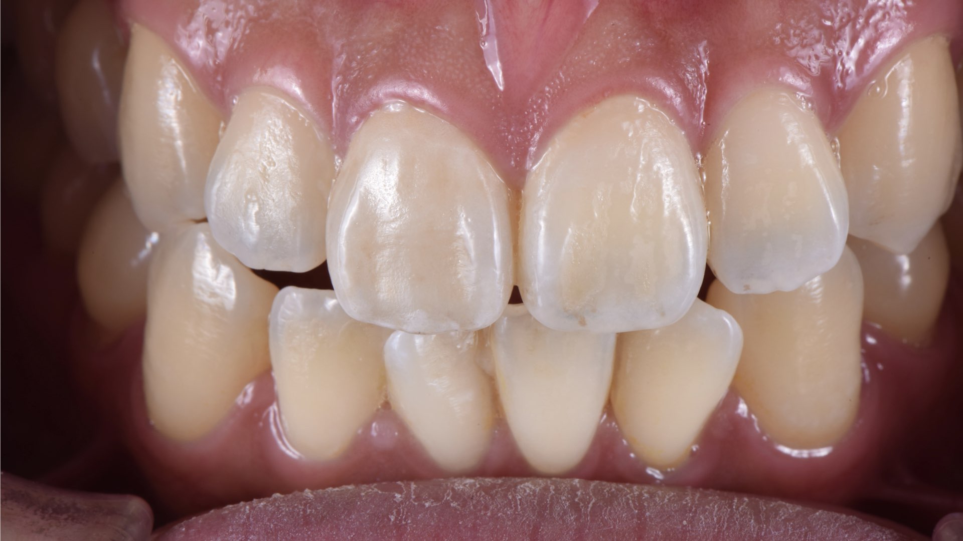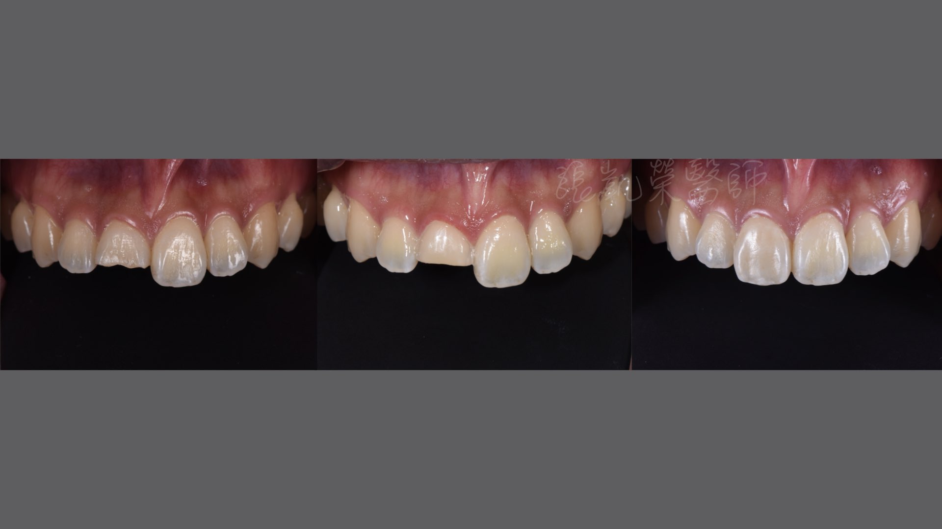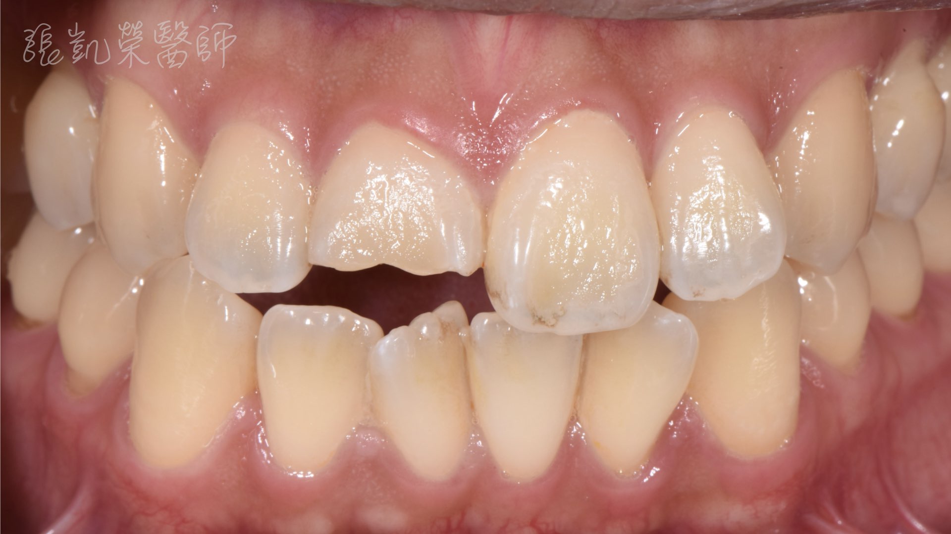 吳先生因為外傷造成門牙斷裂,而且位置就是在正中門牙,所以不論講話、發音、吃飯、一般社交都有很大的困擾。 來到榮醫師的門診,除了描述外傷病史外,還希望用『貼片』修復,能夠對牙齒傷害比較小。 聽到這裡,榮醫師心裡喜憂參半,喜的是,這樣的觀念很正確,對組織越小的傷害影響,這正是榮醫師治療的準則;但不要說貼片薄如0.5mm的空間,就算是一般全瓷冠1~1.5mm的修復空間,要做到單顆正中門牙型態、顏色、光澤、細節與鄰牙相似,也是很困難的,更何況在極薄0.5~1mm空間內模仿隔壁的牙齒。 榮醫師跟神隊友---賴宏昇技師討論後,加上許多細節上調整,終於不負吳先生的信任,又完成了一次艱鉅的任務。