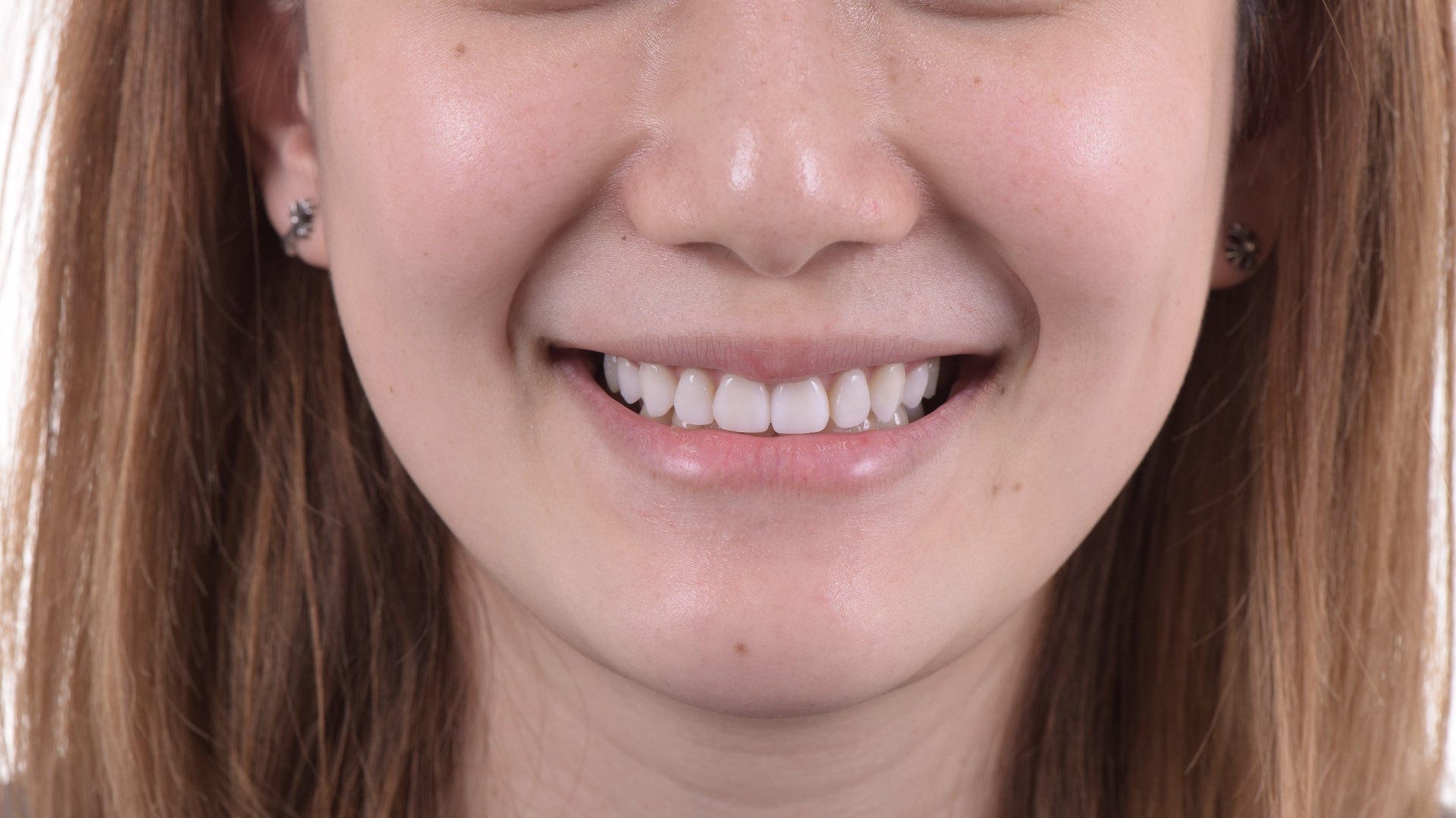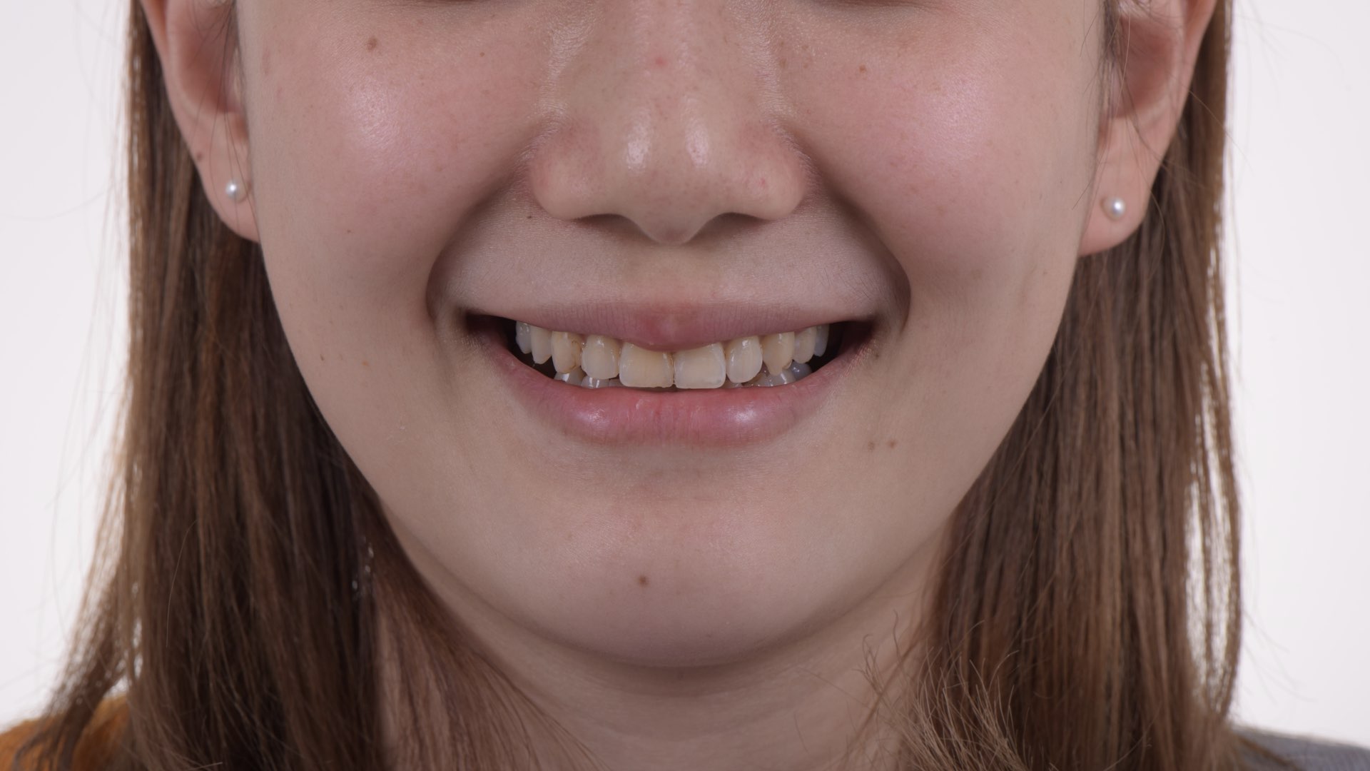 方小姐接受牙齒矯正後,雖然牙齒排整齊了,但總覺得牙齒笑起來不夠亮白,由於矯正後牙齒位置已經很好,排列、微笑曲線矯正醫師都已經安排完整,所以就針對理想的顏色做討論,榮醫師發現,方小姐想要潔白無瑕的笑容,所以榮醫師幫她選了美白後的瓷塊貼片,讓方小姐可以一直維持在潔白無瑕的笑容囉。 顏色偏黃,有局部樹脂填補變色 美白貼片 美白貼片