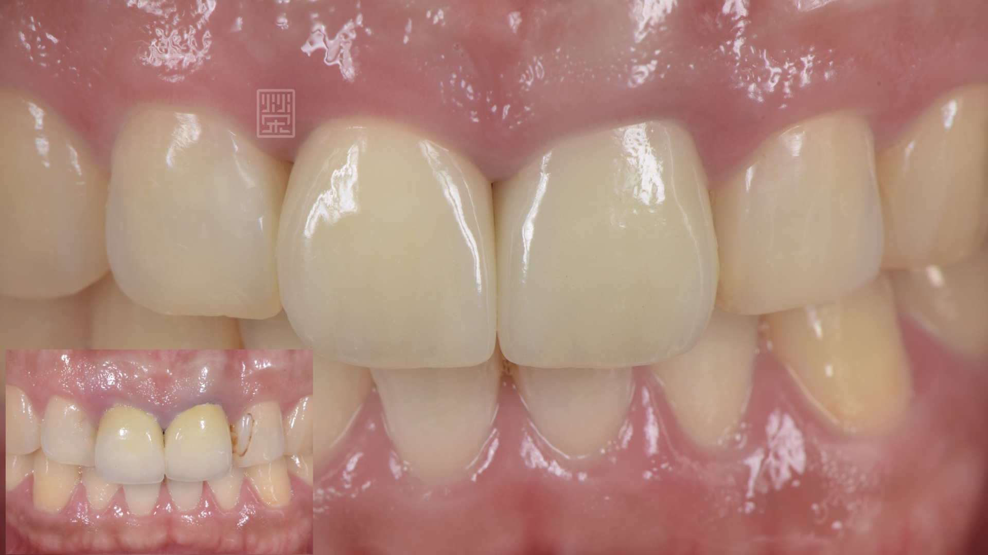 王先生多年前完成假牙治療,這陣子突然咬東西會覺得不舒服,而且覺得假牙變長、牙齦邊緣變黑。 榮醫師檢查完後,發現除了舊的假牙邊緣變色外,還有個很嚴重的問題,因為很年輕的時候牙齒就根管治療,牙齒齒壁很薄,當時釘子很粗壯,長期下來,牙根已經產生裂痕。 拆下假牙後,果不其然在牙根中看到裂痕,跟王先生解說後,告知無法保留牙齒,討論後決定以植牙修補這顆牙齒,再將側門牙的舊樹脂,利用全瓷植牙之台與全瓷冠修復,恢復美觀與健康。 假牙邊緣變色、樹脂變色、牙齒變長 牙根有裂痕 植牙臨時假牙 全瓷支台 植牙全瓷冠完成